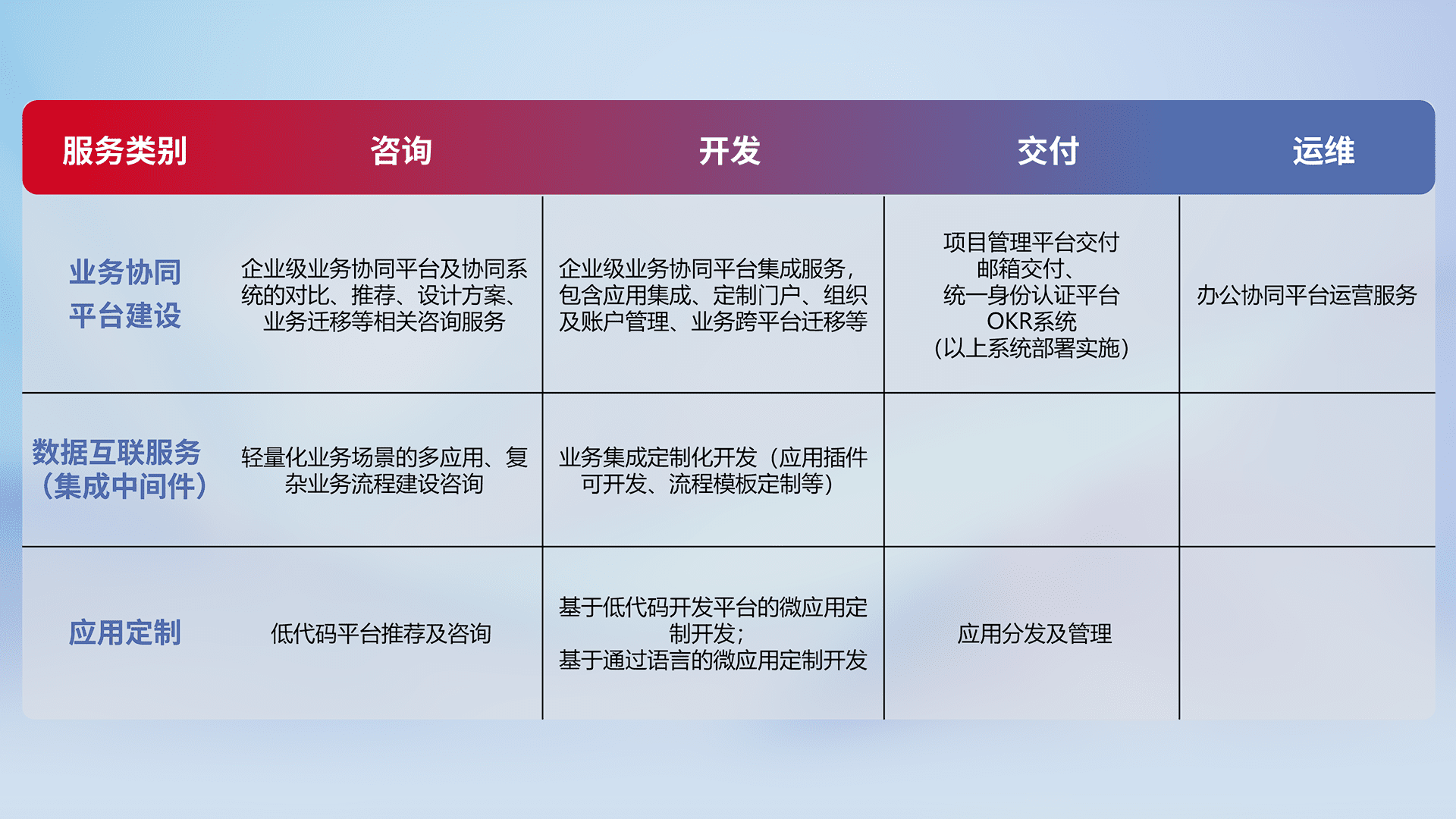 针对钉钉、、、、企微、、、IDaas等平台级产品提供产品的规划、、、方案、、、交付、、、定制化开发等服务,,,实现如统一协同办公、、智能客户服务、、、混合会议管理、、、智能数据查询、、、等业务场景,,,实现数字化转型。。。。